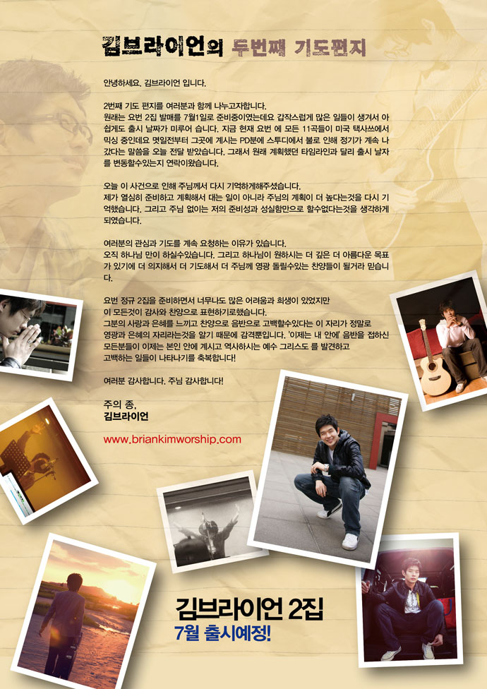 찬양 사역자 김브라이언이 보내온 2번째 기도편지! 아쉽게도 앨범출시가 연기된다네요. 여전이 서툰 한글맞춤법(:이지만 진심어린 내용 함께 나누어 주시고 김브라이언 2집의 완성을 위해서 많은 기도와 관심을 부탁합니다~