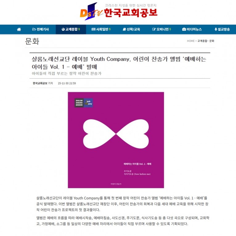 [기사] 샬롬노래선교단 레이블 Youth Company, 어린이 찬송가 앨범 ‘예배하는 아이들 Vol. 1 - 예배’ 발매(한국교회공보)