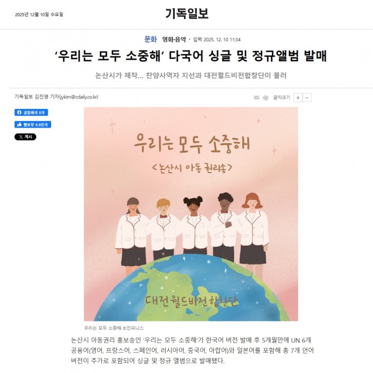 논산시 아동권리 홍보송인 ‘우리는 모두 소중해’가 한국어 버전 발매 후 5개월만에 UN 6개 공용어(영어, 프랑스어, 스페인어, 러시아어, 중국어, 아랍어)와 일본어를 포함해 총 7개 언어버전이 추가로 포함되어 싱글 및 정규 앨범으로 발매됐다.