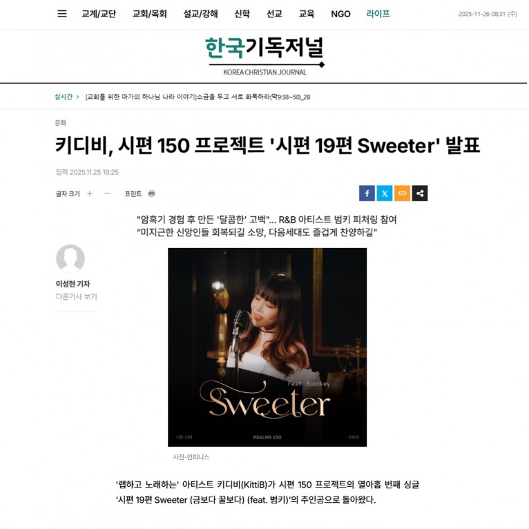 [기사] 키디비, 시편 150 프로젝트 '시편 19편 Sweeter' 발표(한국기독저널)