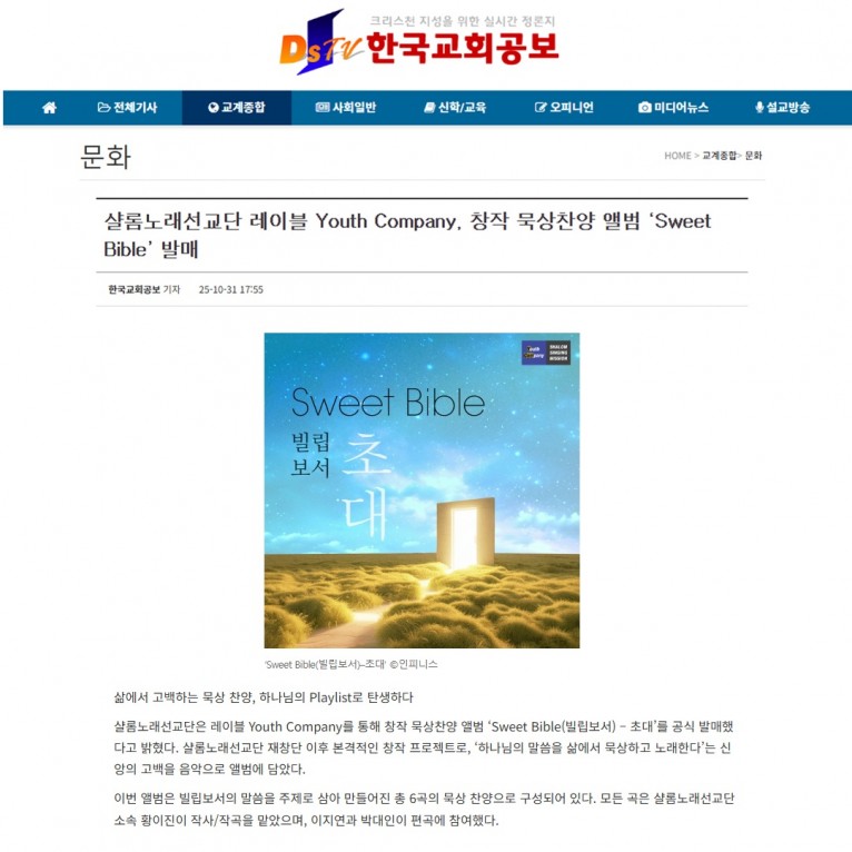 [기사] 샬롬노래선교단 레이블 Youth Company, 창작 묵상찬양 앨범 ‘Sweet Bible’ 발매(한국교회공보)