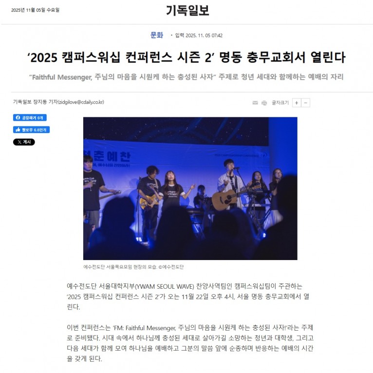 [기사] ‘2025 캠퍼스워십 컨퍼런스 시즌 2’ 명동 충무교회서 열린다(기독일보)