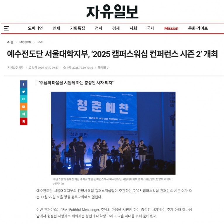 뮤직타임 [기사] 예수전도단 서울대학지부, ‘2025 캠퍼스워십 컨퍼런스 시즌 2’ 개최(자유일보)
