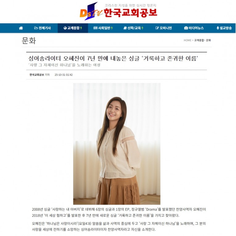 [기사] 싱어송라이터 오혜진이 7년 만에 내놓은 싱글 ‘거룩하고 존귀한 이름‘(한국교회공보)