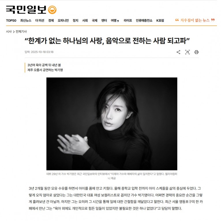 뮤직타임 [기사] 박기영, “한계가 없는 하나님의 사랑, 음악으로 전하는 사람 되고파”(국민일보)