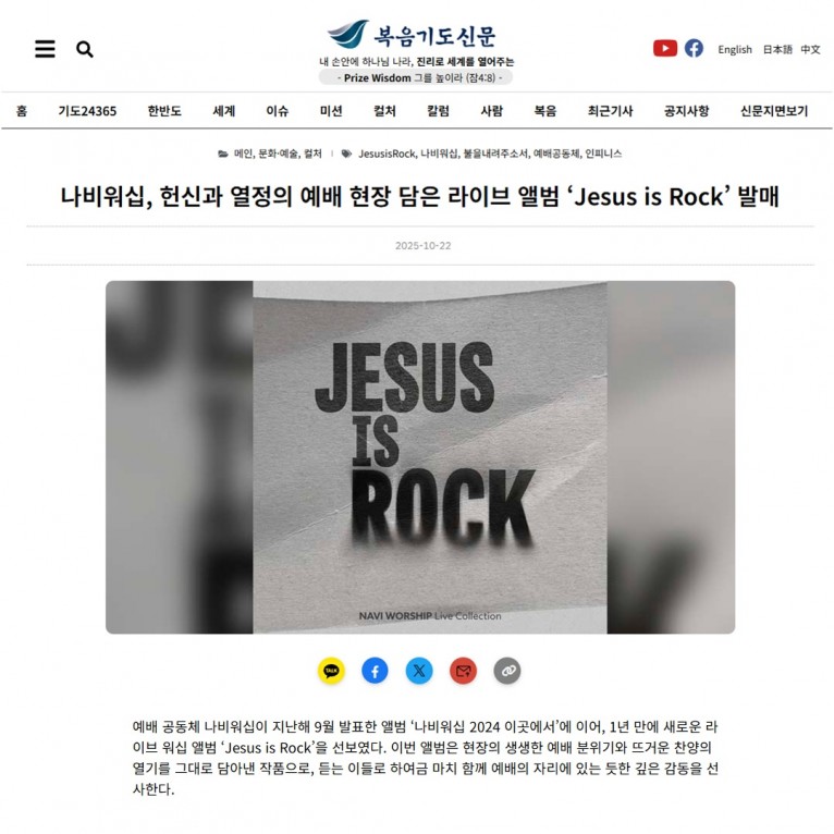 뮤직타임 [기사] 나비워십, 헌신과 열정의 예배 현장 담은 라이브 앨범 ‘Jesus is Rock’ 발매(복음기도신문)