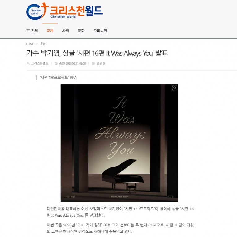 뮤직타임 [기사] 가수 박기영, 싱글 ‘시편 16편 It Was Always You’ 발표(크리스천월드)