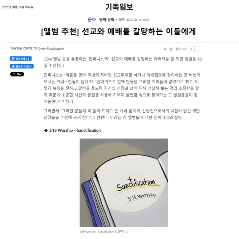 수원지역에서 활발히 활동하는 3:16 Worship(삼일육워십)의 세 번째 정규 앨범 ‘Sanctification’인데 ‘나의 기도’, ‘찬양해 할렐루야’ 등 10트랙이 수록된 이 앨범에는 오랫동안 소리엘로 사역하고 있는 지명현 목사가 반갑게 피처링으로 참여해 ‘주는 나의’를 불러 함께 했으며 그동안 호흡을 맞춰온 3:16 Worship팀의 멤버들과 함께 완성했다. 오랫동안 지켜보게 된 팀인데 갈수록 음악적으로도 완성도가 높아지고, 메시지도 깊이 있어 지는 것을 아주 흥미롭게 주목하고 있는 팀이다.
