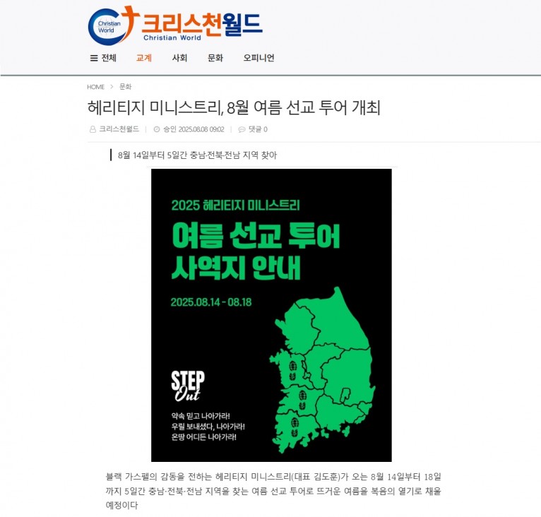 [기사] 헤리티지 미니스트리, 8월 여름 선교 투어 개최(크리스천월드)