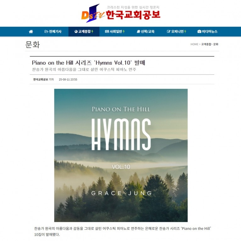 [기사] Piano on the Hill 시리즈 'Hymns Vol.10' 발매(한국교회공보)