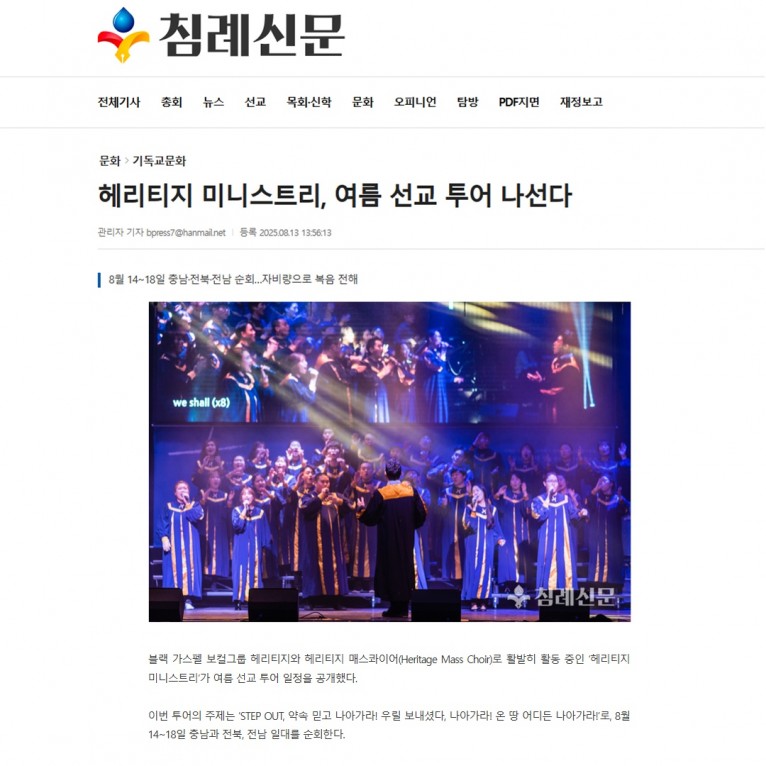 뮤직타임 [기사] 헤리티지 미니스트리, 여름 선교 투어 나선다(침례신문)