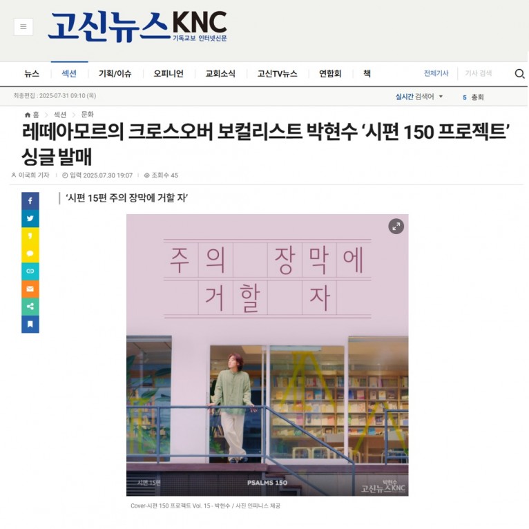 [기사] 레떼아모르의 크로스오버 보컬리스트 박현수 ‘시편 150 프로젝트’ 싱글 발매(고신뉴스 KNC)