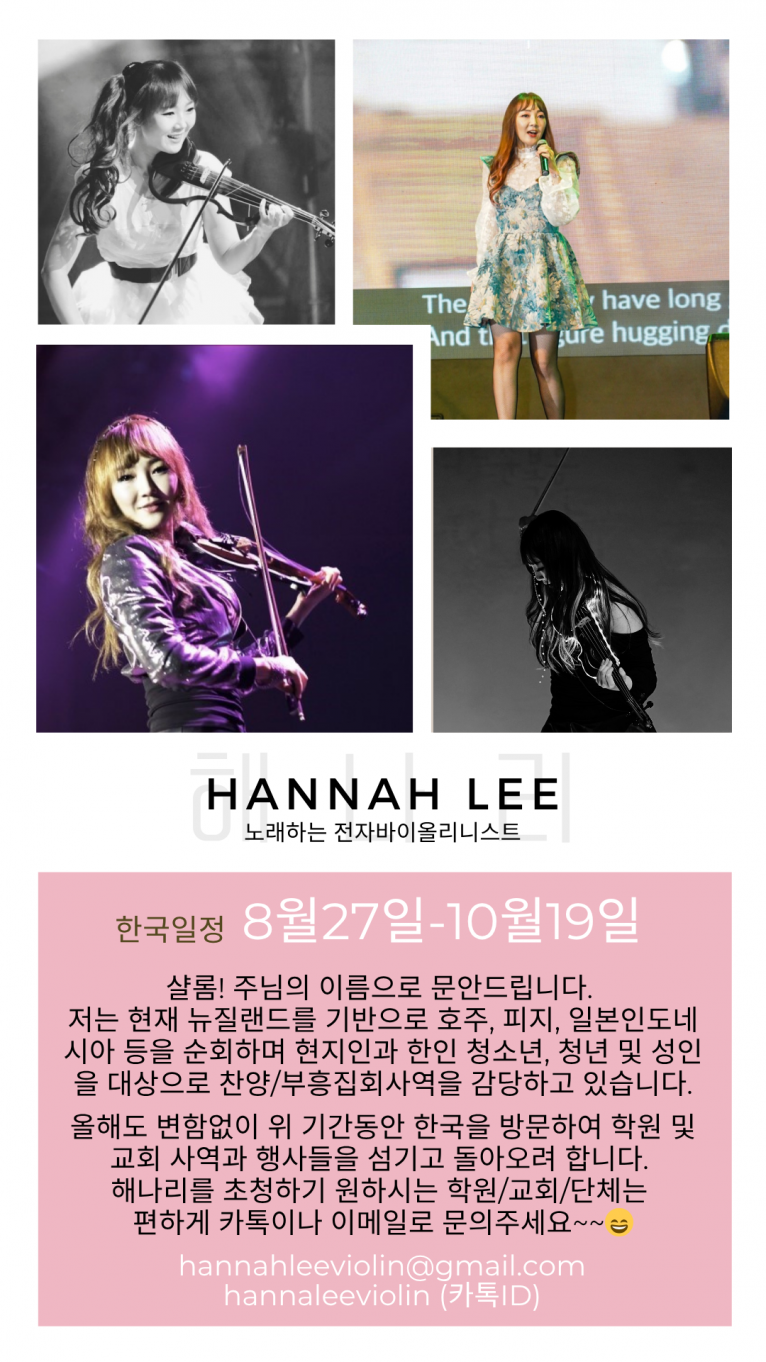 이번 내한기간동안 사역을 원하는 교회, 학교, 방송사 등은 hannahleeviolin@gmail.com, hannaleeviolin(카톡ID), 010-9852-8082(문자)로 문의하면 된다.
