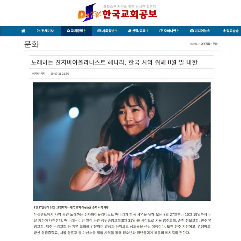 [기사] 노래하는 전자바이올리니스트 해나리, 한국 사역 위해 8월 말 내한(한국교회공보)