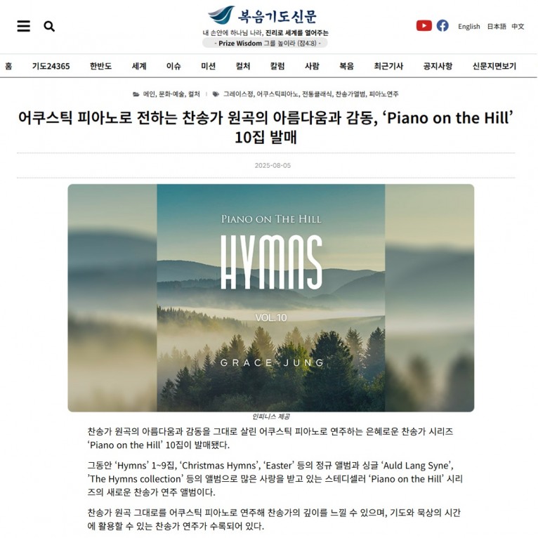 뮤직타임 [기사] 어쿠스틱 피아노로 전하는 찬송가 원곡의 아름다움과 감동, ‘Piano on the Hill’ 10집 발매(복음기도신문…