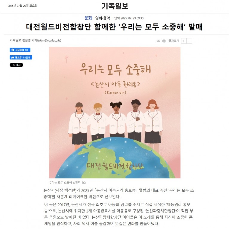 [기사] 대전월드비전합창단 함께한 ‘우리는 모두 소중해’ 발매(기독일보)