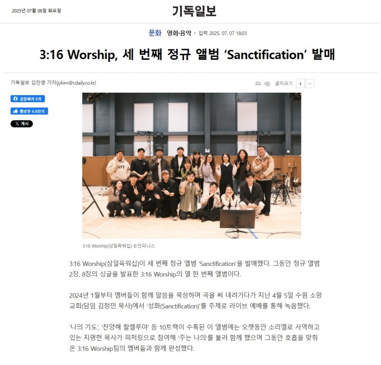 뮤직타임 [기사] 3:16 Worship, 세 번째 정규 앨범 ‘Sanctification’ 발매(기독일보)