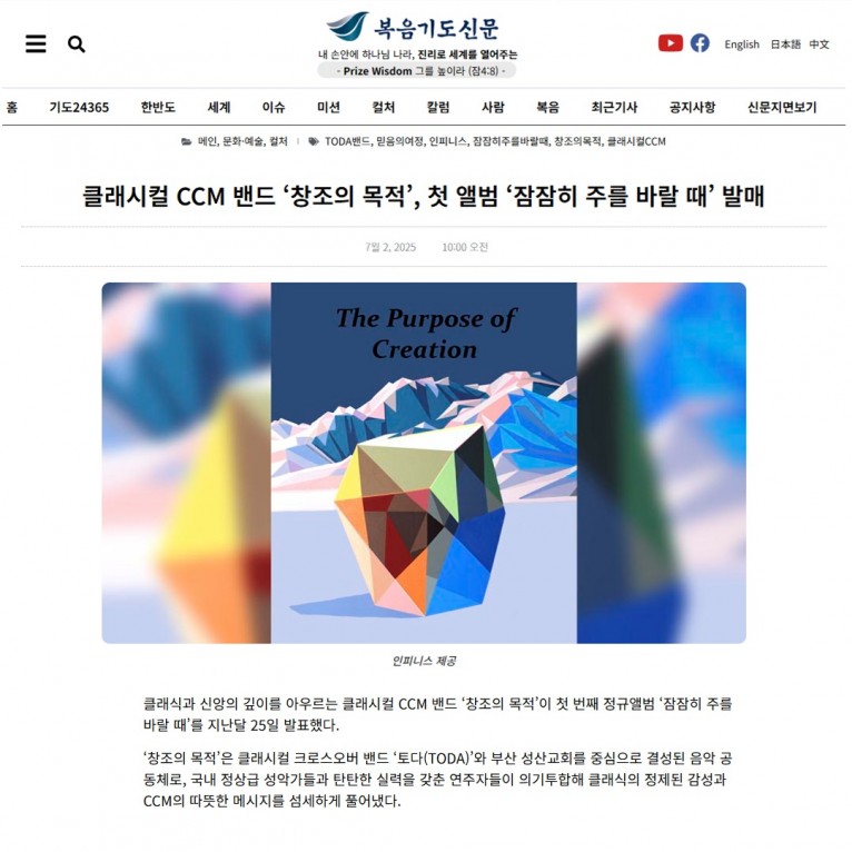 뮤직타임 [기사] 클래시컬 CCM 밴드 ‘창조의 목적’, 첫 앨범 ‘잠잠히 주를 바랄 때’ 발매(복음기도신문)