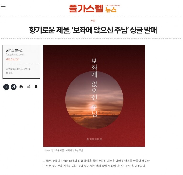 [기사] 향기로운 제물, ‘보좌에 앉으신 주님’ 싱글 발매(풀가스펠뉴스)