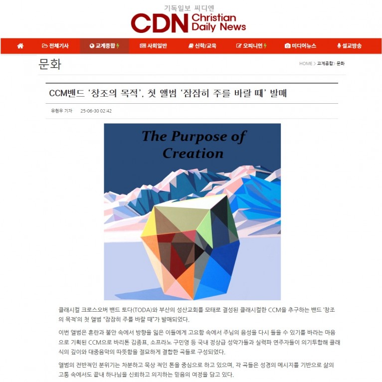 클래시컬 크로스오버 밴드 토다(TODA)와 부산의 성산교회를 모태로 결성된 클래시컬한 CCM을 추구하는 밴드 ‘창조의 목적’의 첫 앨범 “잠잠히 주를 바랄 때”가 발매되었다.