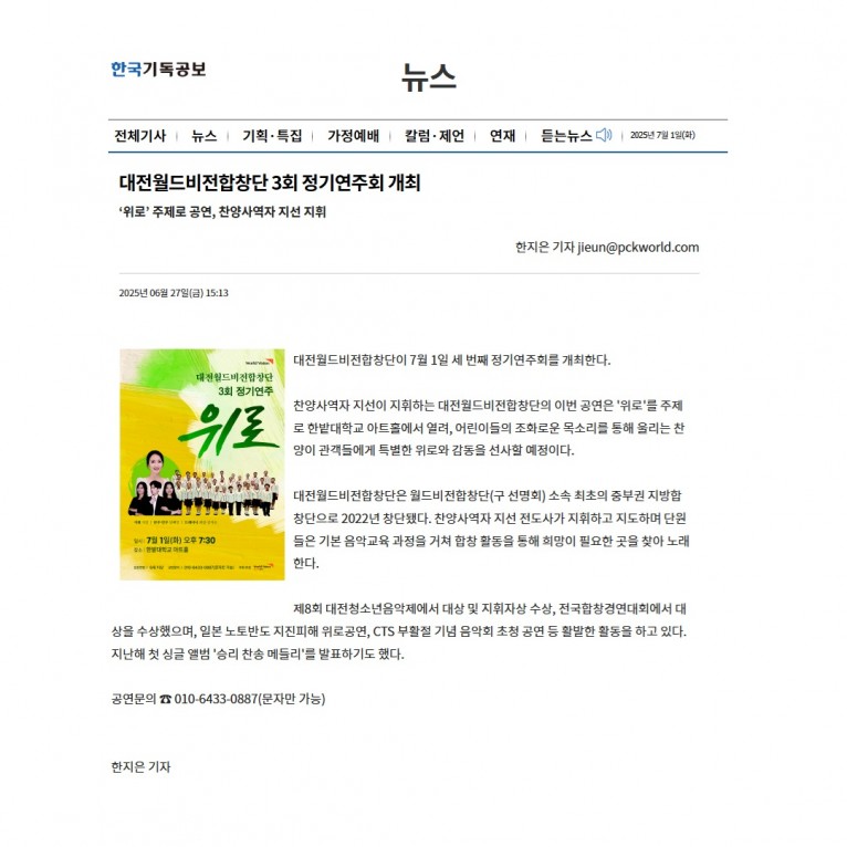 뮤직타임 [기사] 대전월드비전합창단 3회 정기연주회 개최(한국기독공보)