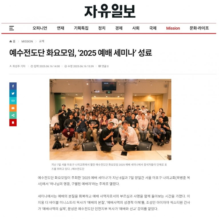 [기사] 예수전도단 화요모임, ‘2025 예배 세미나’ 성료(자유일보)
