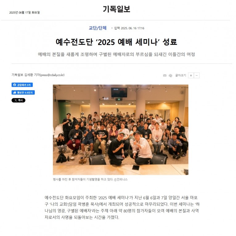 뮤직타임 [기사] 예수전도단 ‘2025 예배 세미나’ 성료(기독일보)