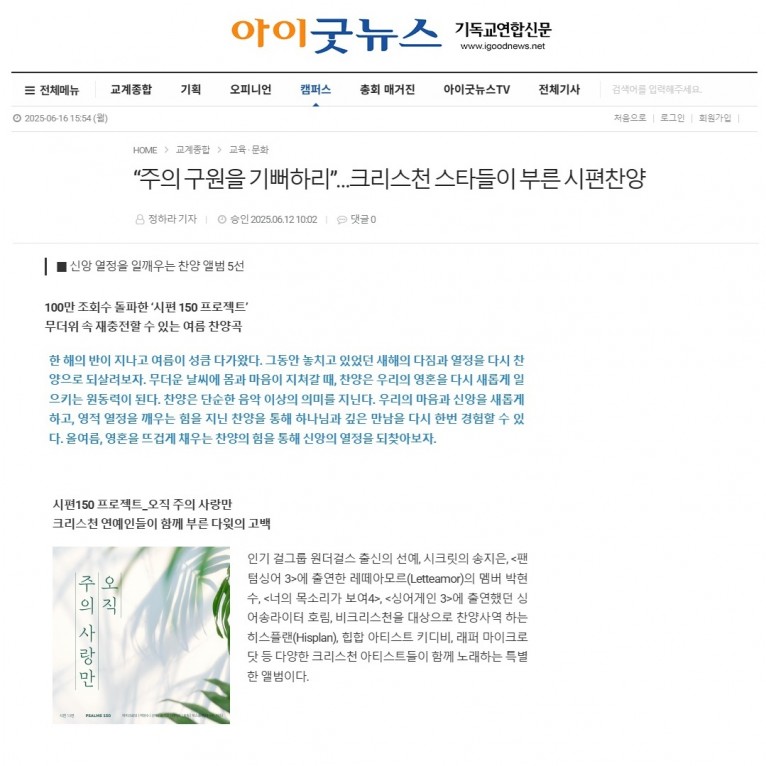 [기사] “주의 구원을 기뻐하리”…크리스천 스타들이 부른 시편찬양(아이굿뉴스)