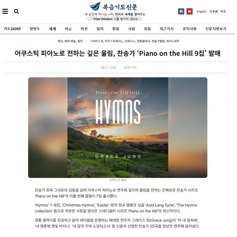 뮤직타임 [기사] 어쿠스틱 피아노로 전하는 깊은 울림, 찬송가 ‘Piano on the Hill 9집’ 발매(복음기도신문)