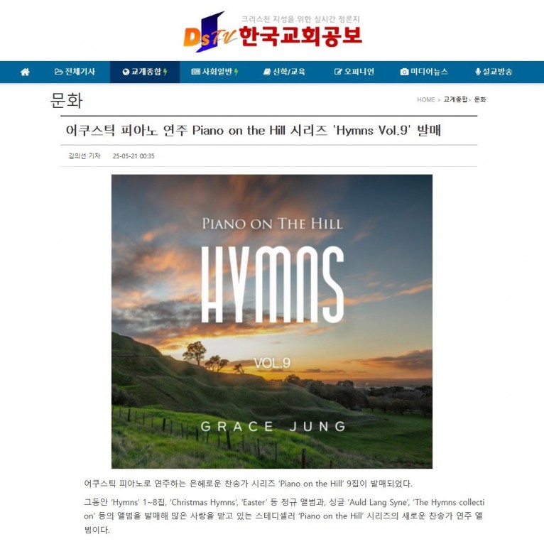 뮤직타임 [기사] 어쿠스틱 피아노 연주 Piano on the Hill 시리즈 'Hymns Vol.9' 발매(한국교회공보)