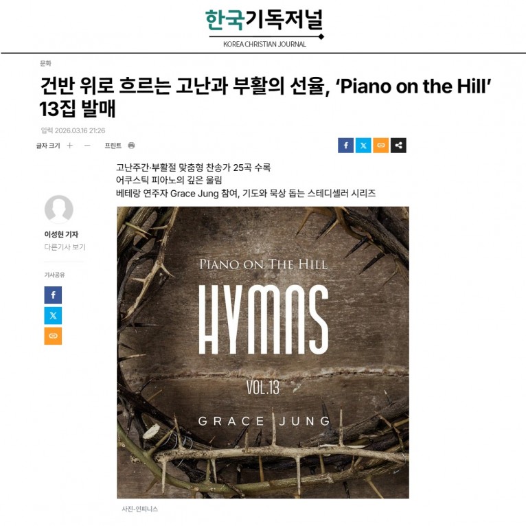 [기사] 건반 위로 흐르는 고난과 부활의 선율, ‘Piano on the Hill’ 13집 발매(한국기독저널)