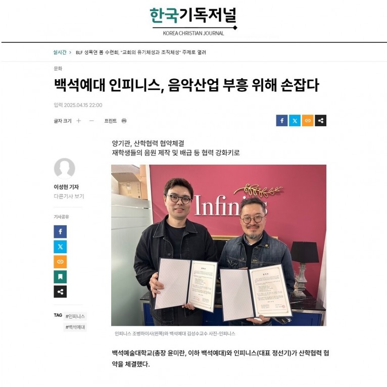 뮤직타임 [기사] 백석예대 인피니스, 음악산업 부흥 위해 손잡(한국기독저널)