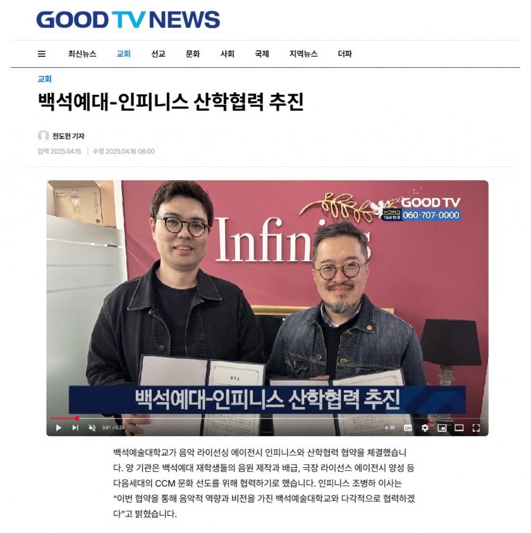 [방송] 백석예대-인피니스 산학협력 추진(GOODTV 기독교복음방송)