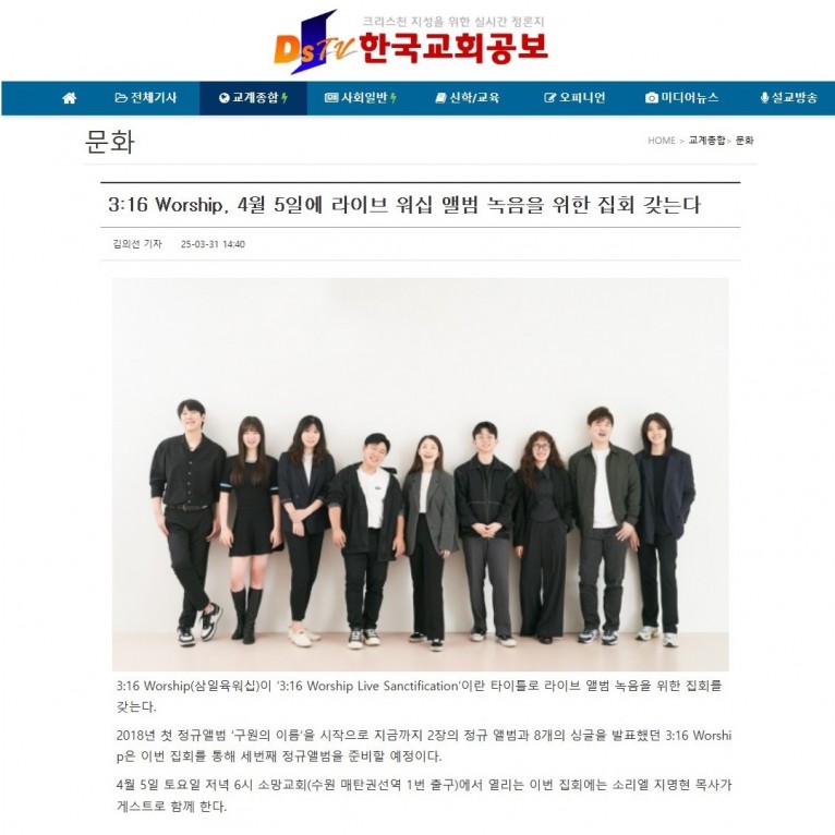 [기사] 3:16 Worship, 4월 5일에 라이브 워십 앨범 녹음을 위한 집회 갖는다(한국교회공보)