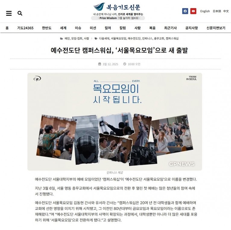 [기사] 예수전도단 캠퍼스워십, ‘서울목요모임’으로 새 출발(복음기도신문)