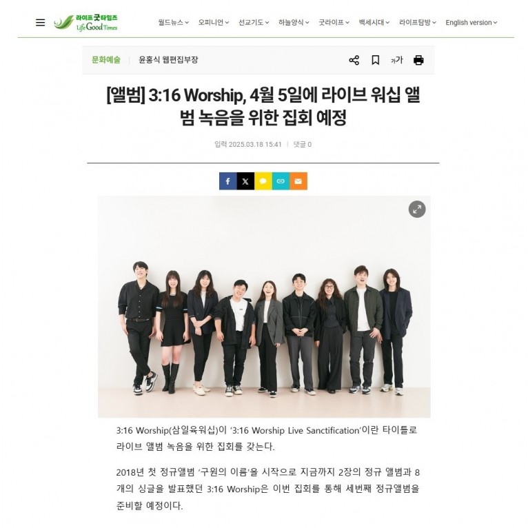 [기사] 3:16 Worship, 4월 5일에 라이브 워십 앨범 녹음을 위한 집회 예정(라이프굿타임즈)