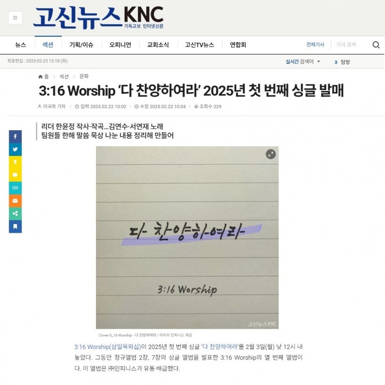 [기사] 3:16 Worship ‘다 찬양하여라’ 2025년 첫 번째 싱글 발매(고신뉴스 KNC)