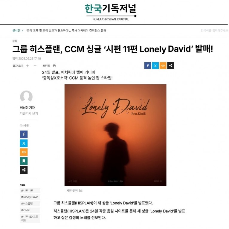 뮤직타임 [기사] 그룹 히스플랜, CCM 싱글 ‘시편 11편 Lonely David’ 발매!(한국기독저널)