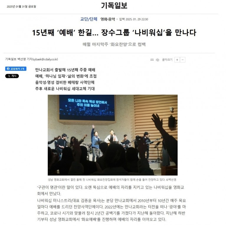 [기사, 인터뷰] 15년째 ‘예배’ 한길… 장수그룹 ‘나비워십’을 만나다(기독일보)