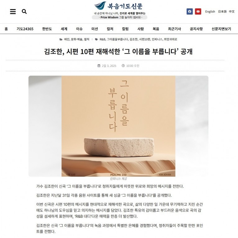 [기사] 김조한, 시편 10편 재해석한 ‘그 이름을 부릅니다’ 공개(복음기도신문)