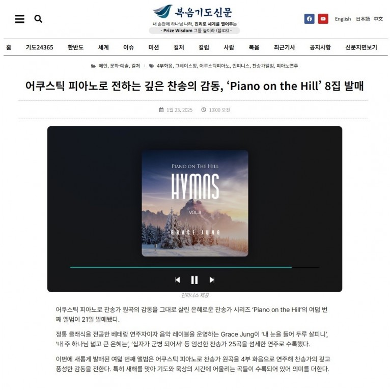 뮤직타임 [기사] 어쿠스틱 피아노로 전하는 깊은 찬송의 감동, ‘Piano on the Hill’ 8집 발매(복음기도신문)