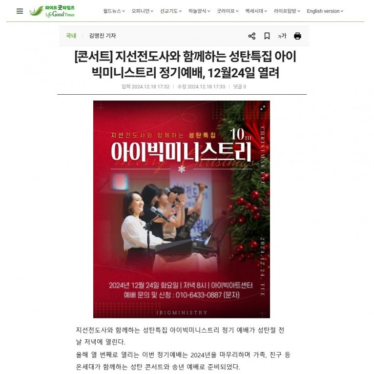 [기사] 지선전도사와 함께하는 성탄특집 아이빅미니스트리 정기예배, 12월24일 열려(라이프굿타임즈)
