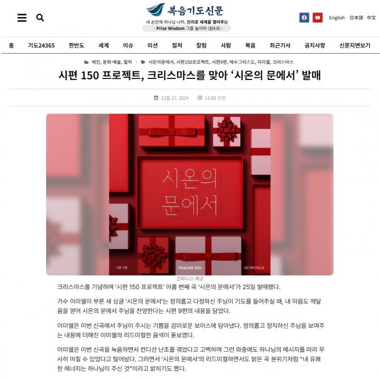 [기사] 시편 150 프로젝트, 크리스마스를 맞아 ‘시온의 문에서’ 발매(복음기도신문)