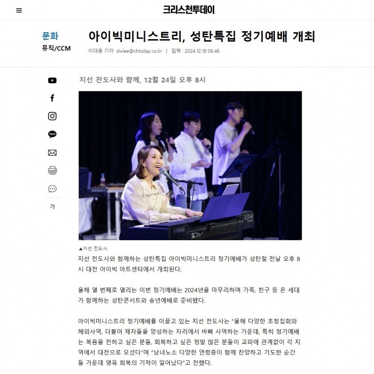 뮤직타임 [기사] 아이빅미니스트리, 성탄특집 정기예배 개최(크리스천투데이)