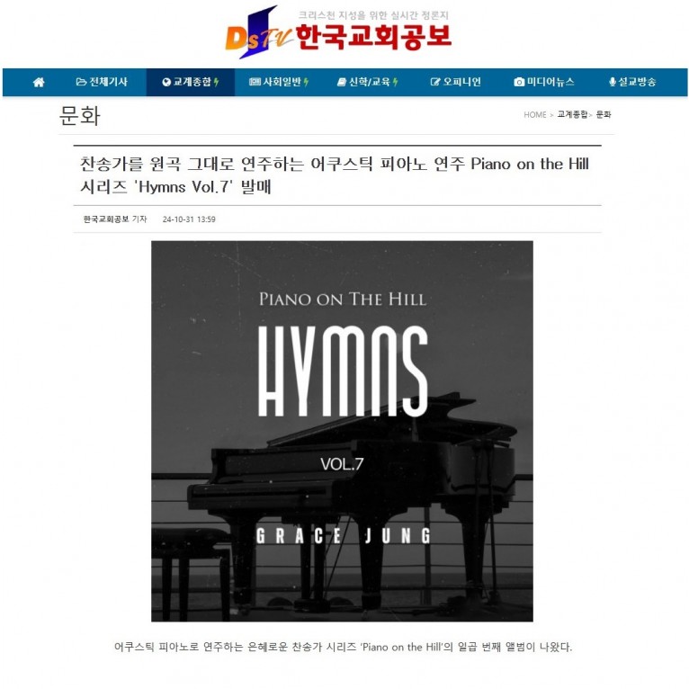 [기사] 찬송가를 원곡 그대로 연주하는 어쿠스틱 피아노 연주 Piano on the Hill 시리즈 'Hymns Vol.7' 발매(한국교회공보)