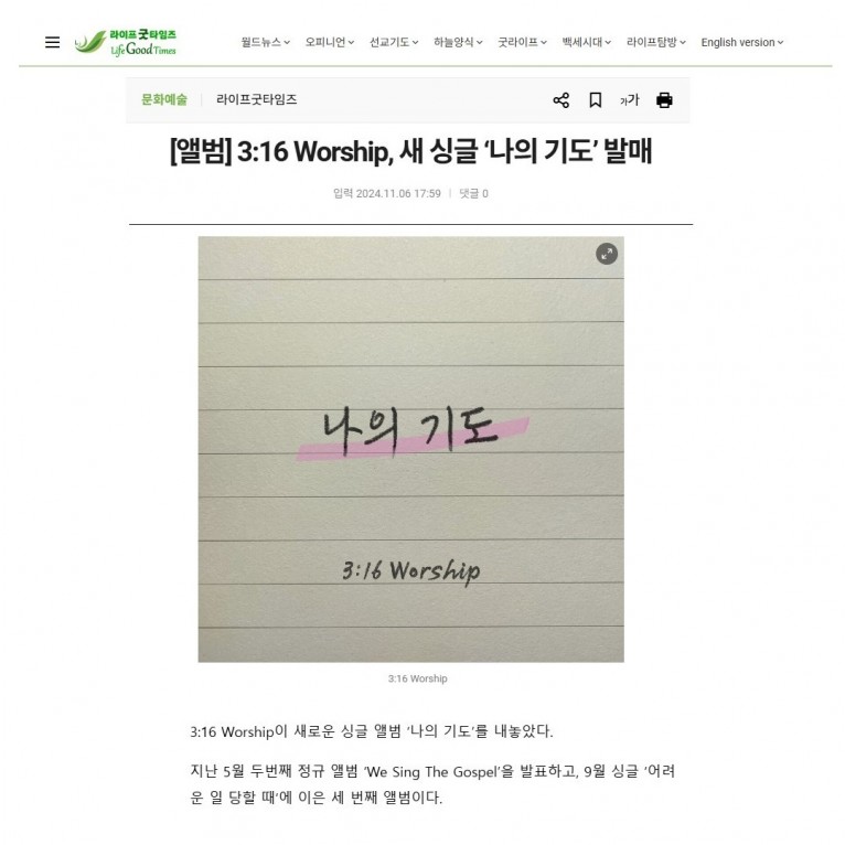 [기사] 3:16 Worship, 새 싱글 ‘나의 기도’ 발매(라이프굿타임즈)