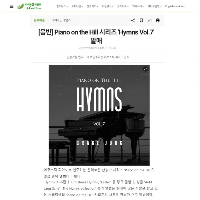 [기사] Piano on the Hill 시리즈 'Hymns Vol.7' 발매(라이프굿타임즈)