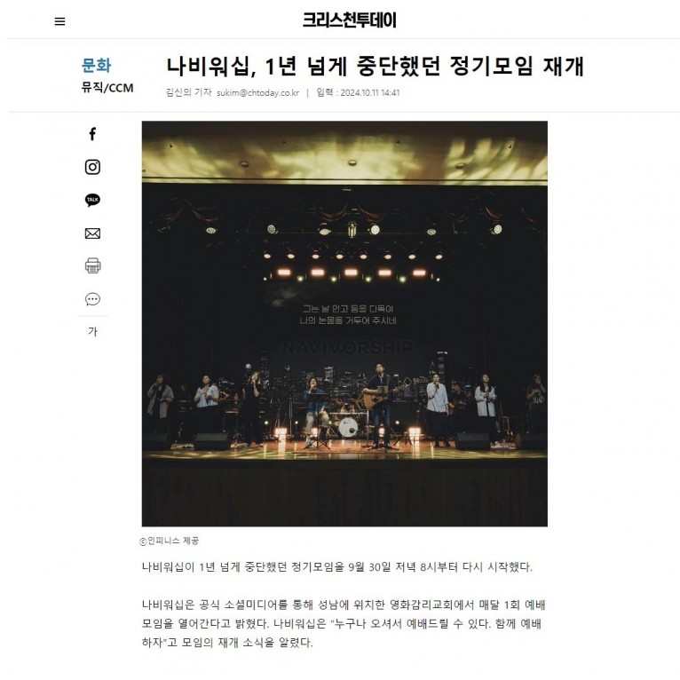 뮤직타임 [기사] 나비워십, 1년 넘게 중단했던 정기모임 재개(크리스천투데이)