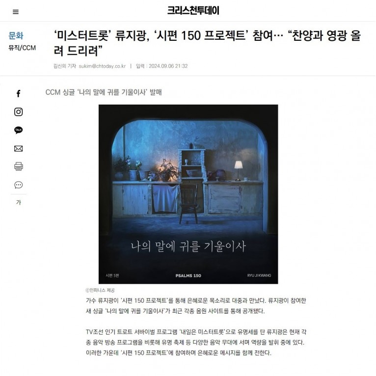 뮤직타임 [기사] ‘미스터트롯’ 류지광, ‘시편 150 프로젝트’ 참여… “찬양과 영광 올려 드리려”(크리스천투데이)