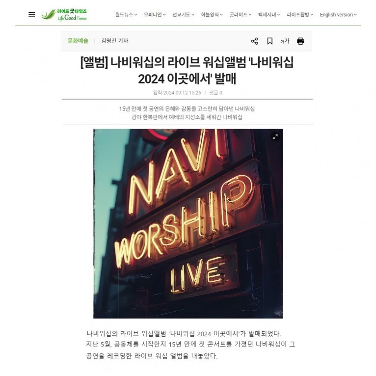 뮤직타임 [기사] 나비워십의 라이브 워십앨범 '나비워십 2024 이곳에서' 발매(라이프굿타임즈)